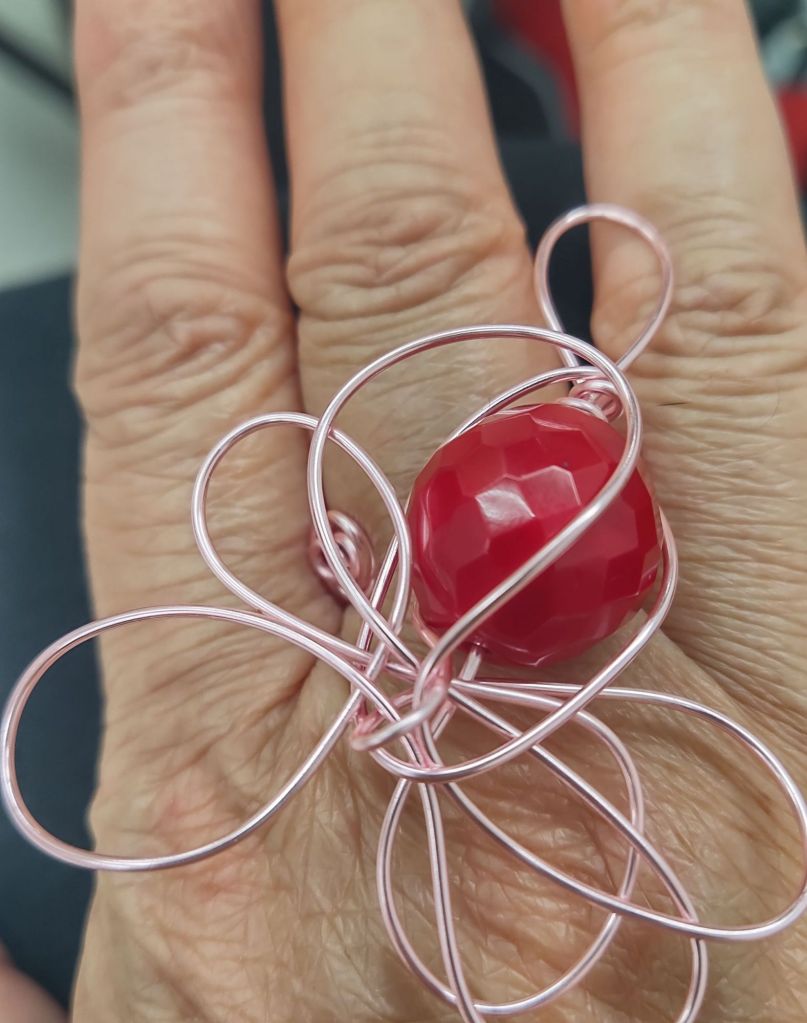 Ring: Pink Copper Wire giant 🍒 Cherry Red faceted Czech Glass -