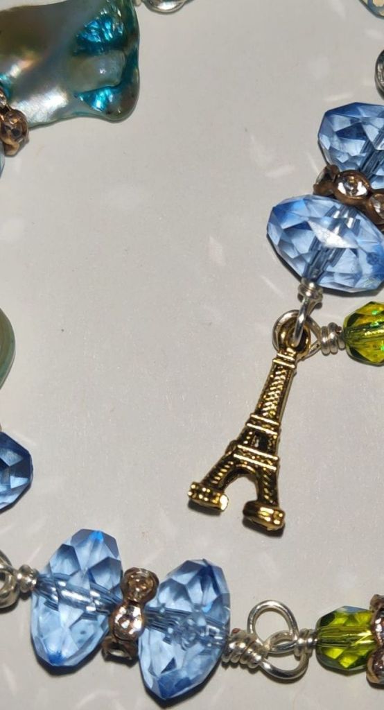 Light blue acrylic beads, blue oyster shells, peridot Czech Glass, gold brass findings, Tour Eiffel charm, silver copper wire handmade clasp