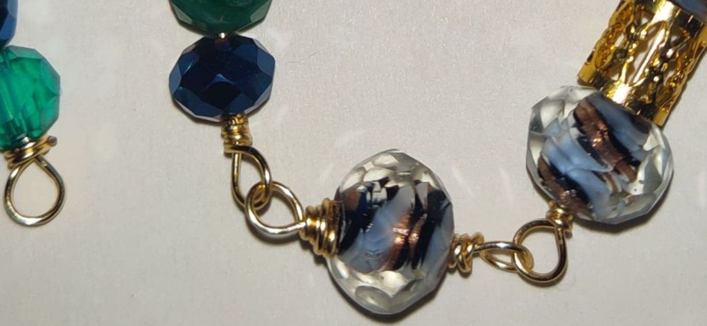 Czech Glass clear ‘tiger’ beads, black, green Czech Glass & gold copper wire -