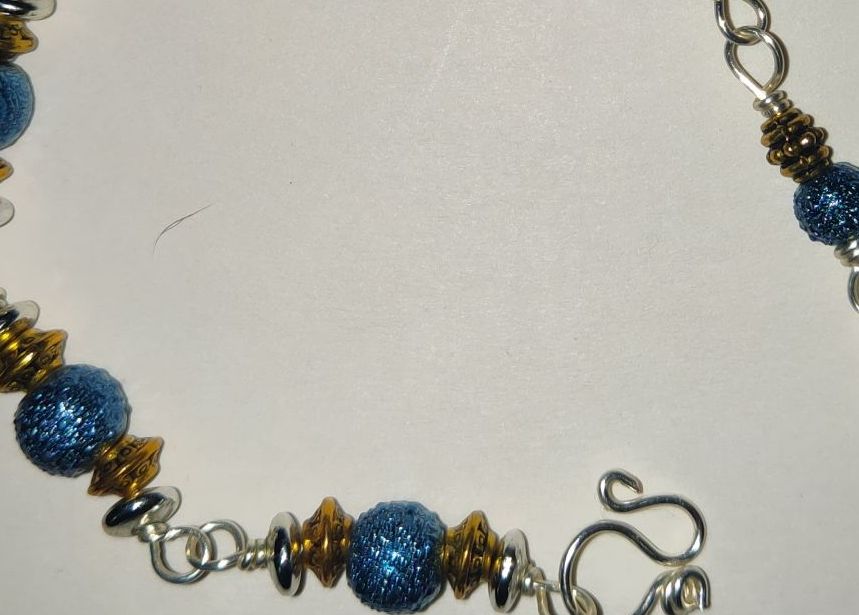 Black Czech glass, blue cobalt square glass, gold copper wire, silver lobster clasp